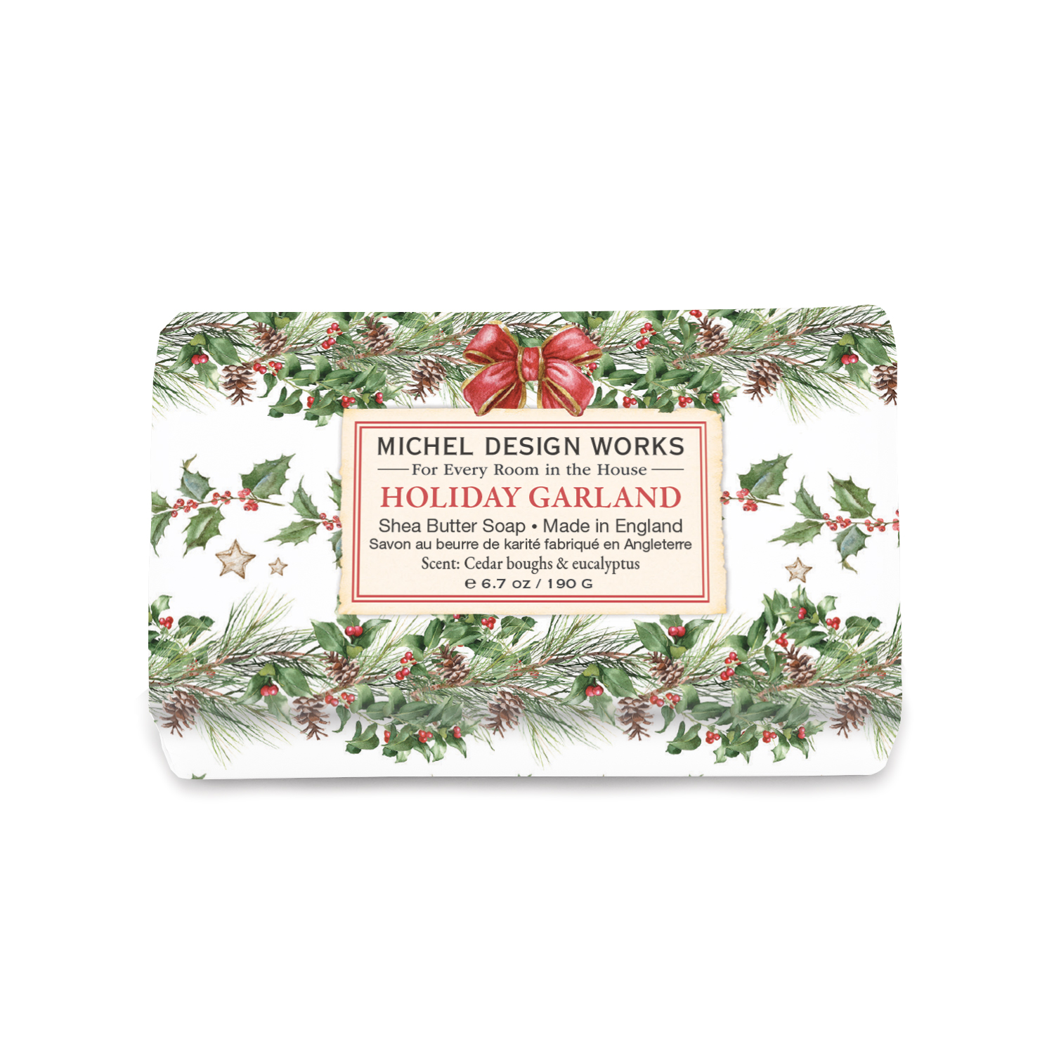 New for 2024! Everyone will delight in Michel Design Works Holiday Garland Medium Soap Bar. Crafted with premium ingredients for a silky-smooth finish, our shea butter soap bar is perfectly sized for use by the sink or in the shower. Exquisitely wrapped in Michel Design artwork , it also makes a great gift, perfect all year round.